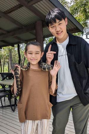 2024年1月、オーストラリアへの家族旅行で記念撮影する土井颯大さん(右)、大地さん兄弟(母かおりさん提供)