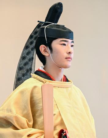 燕尾纓の冠を着け「加冠の儀」に臨まれる秋篠宮家の長男悠仁さま=6日午前10時19分、宮殿・春秋の間(代表撮影)