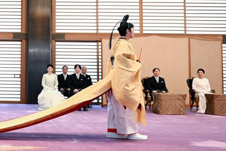 「加冠の儀」で燕尾纓の冠を着け、天皇、皇后両陛下と秋篠宮ご夫妻に一礼される悠仁さま=6日午前10時13分、宮殿・春秋の間(代表撮影)