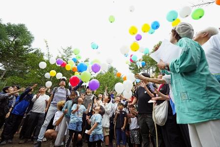 1985年の日航ジャンボ機墜落事故から40年となり、現場の尾根に立つ「昇魂之碑」で遺族らが亡くなった人たちを追悼した=8月12日、群馬県上野村