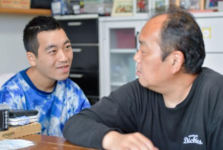 自宅で談笑する青塚琉時さん(左)と父の慎一さん=7月、茨城県神栖市