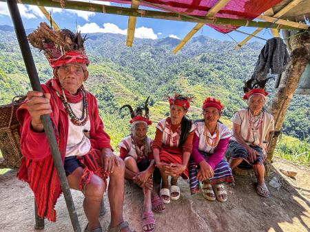 フィリピン・バナウェのビューポイントの露店で、伝統衣装を着て集まるお年寄り。棚田で働けなくなり、観光客と記念撮影してチップを稼ぐ=2025年4月(共同)