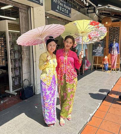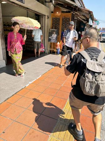 伝統衣装ケバヤを楽しむ観光客=2025年7月、マレーシア・マラッカ(共同)