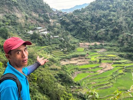 フィリピン・バナウェのバンガアン集落の棚田を示すガイドのドミン・キンマヨンさん。一部に野菜が植えられていると説明する=2025年4月(共同)