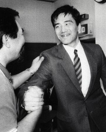 1990年9月、支援者と無罪判決を喜ぶ前川彰司さん