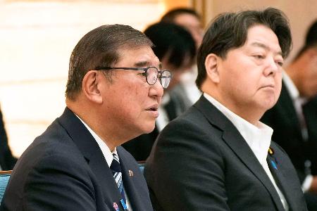 「新しい地方経済・生活環境創生本部」の会合で発言する石破首相(左)=2日午前、首相官邸