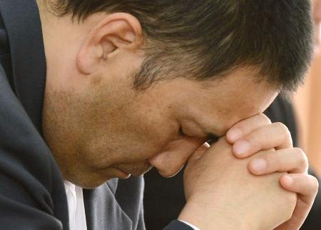 2013年3月、再審開始取り消し後の記者会見でうなだれる前川彰司さん=名古屋市中区