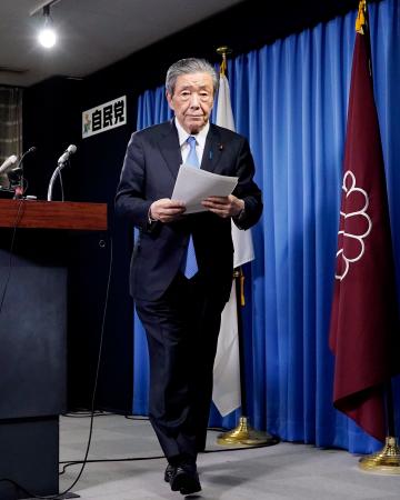 自民党の両院議員総会後、記者会見を終えた森山幹事長=2日午後、東京・永田町の党本部