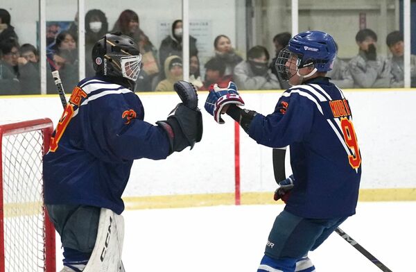 アイスホッケー2回戦 3得点を挙げたFW三浦(右)と無失点に抑えたGK渡辺がハイタッチ=細尾ドームリンク、橋本裕太撮影