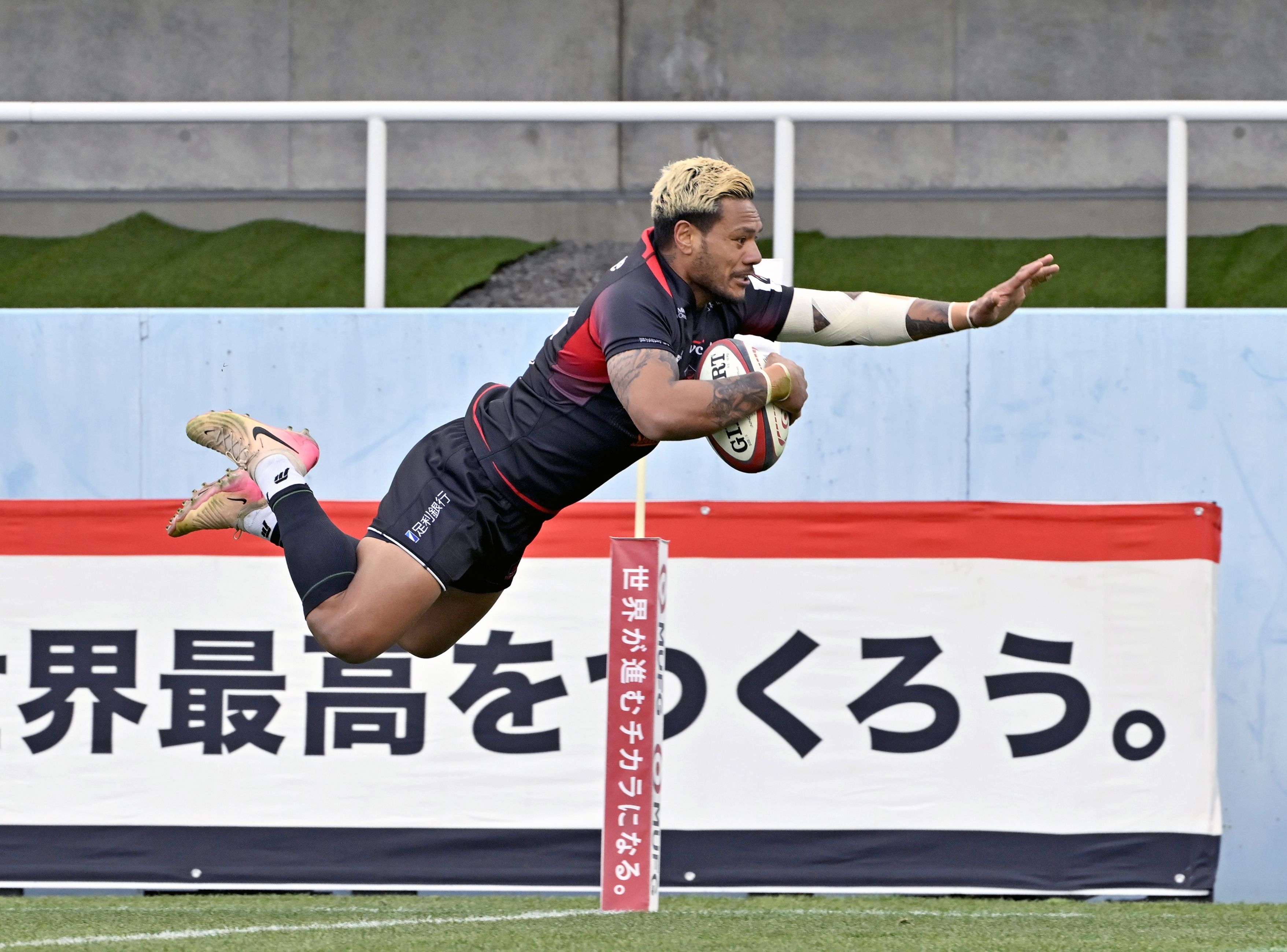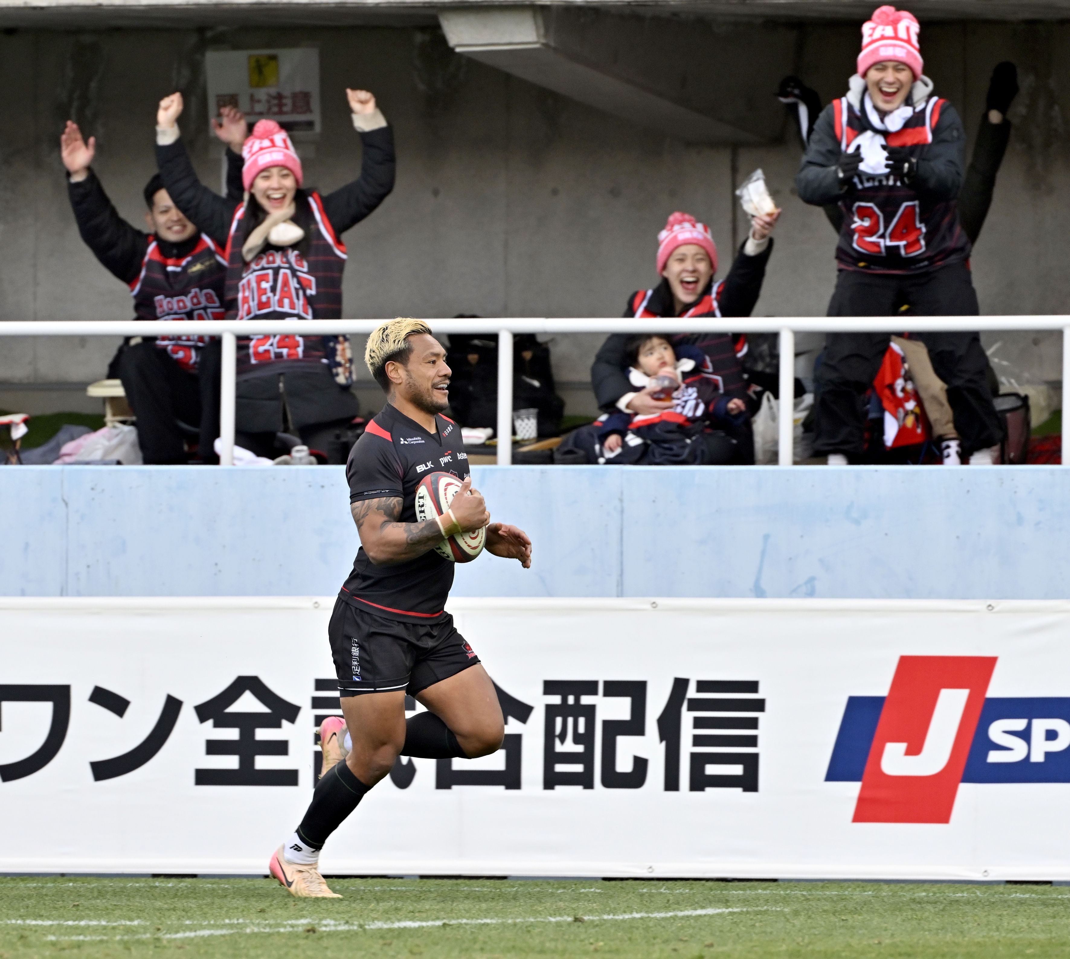後半22分、ホンダヒートのFBレメキがトライを決める=ホンダヒート・グリーンスタジアム、広瀬華撮影