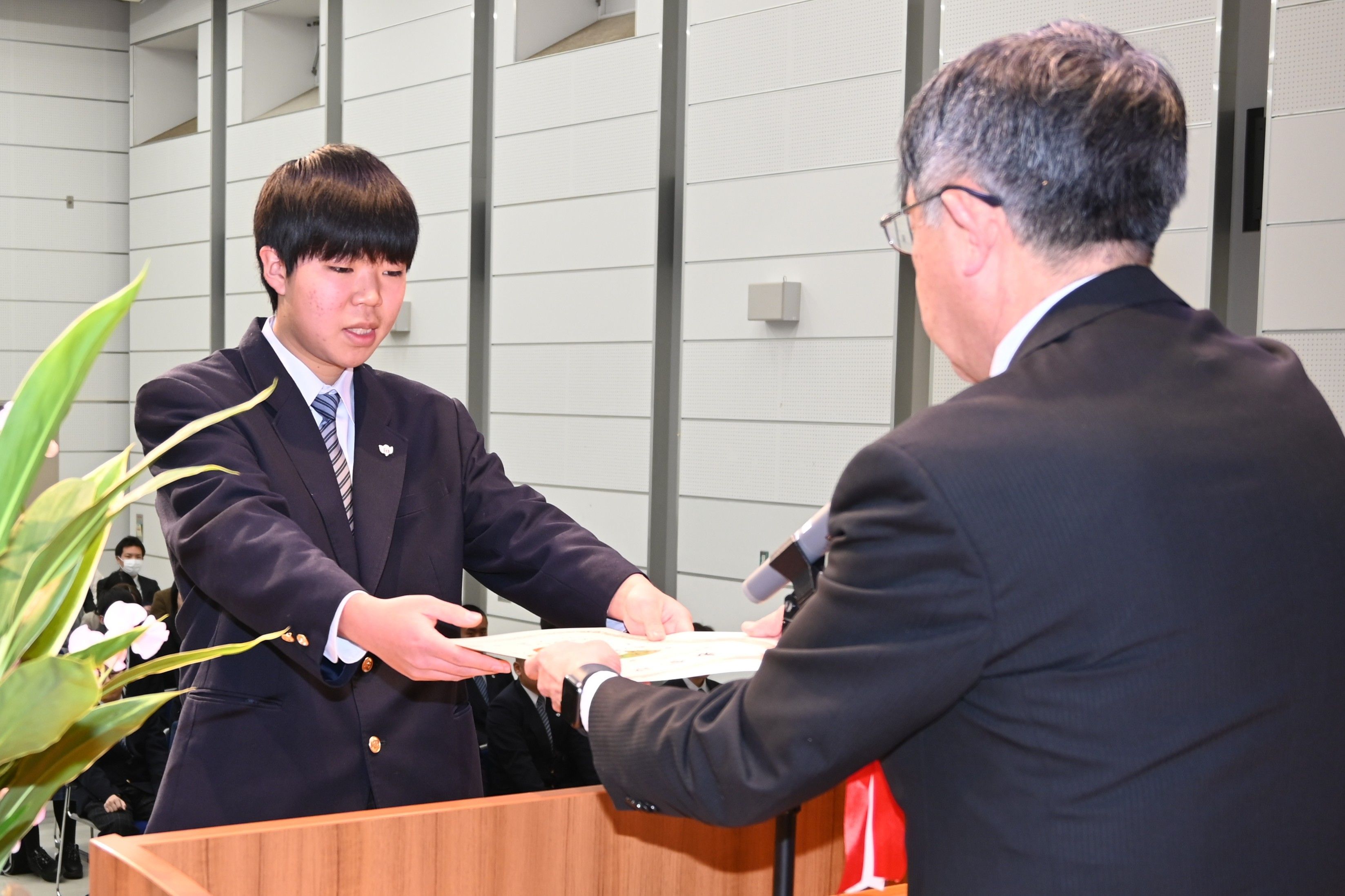 石崎教育長から表彰を受ける生徒