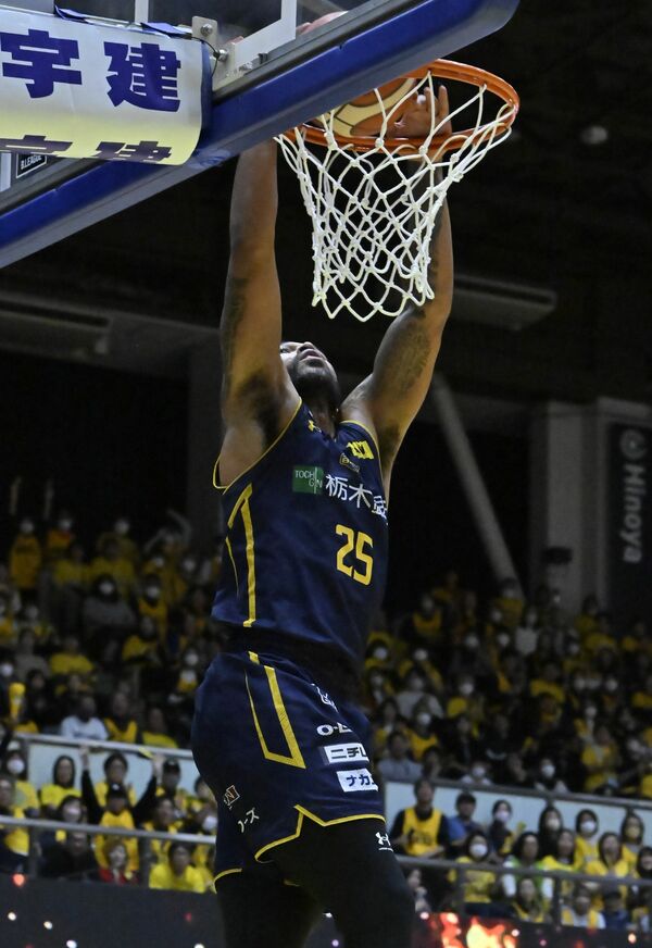 第3クオーター8分、ブレックスのニュービルがスチールからダンクシュートを決める=ブレックスアリーナ宇都宮、加藤竜矢撮影