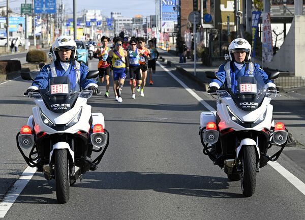 往路を先導する県警の白バイ隊員=宇都宮市、森田大地撮影