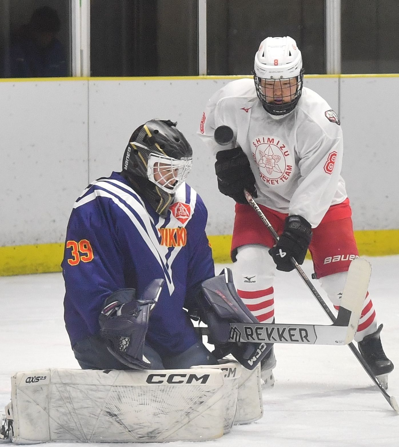 アイスホッケー準々決勝 第1ピリオド10分、シュートをセーブする日光明峰のGK渡辺(左)=日光霧降アイスアリーナ、内藤大地撮
