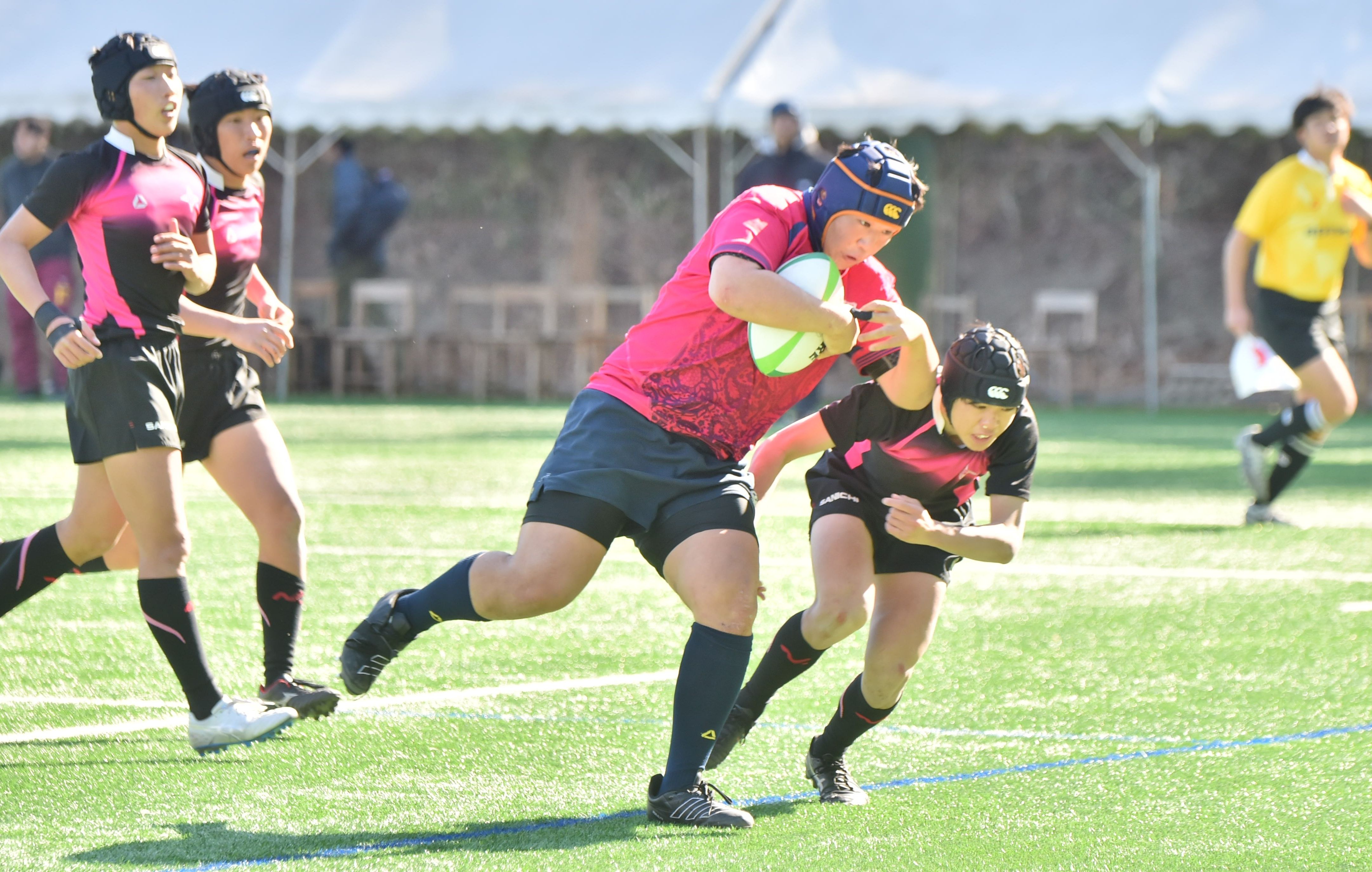 前半26分、国学栃木のプロップ前浜(中央)が相手のタックルを受けながら攻め上がる=国学栃木高ラグビー場