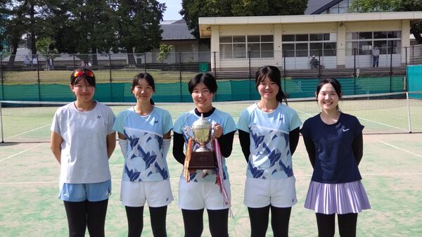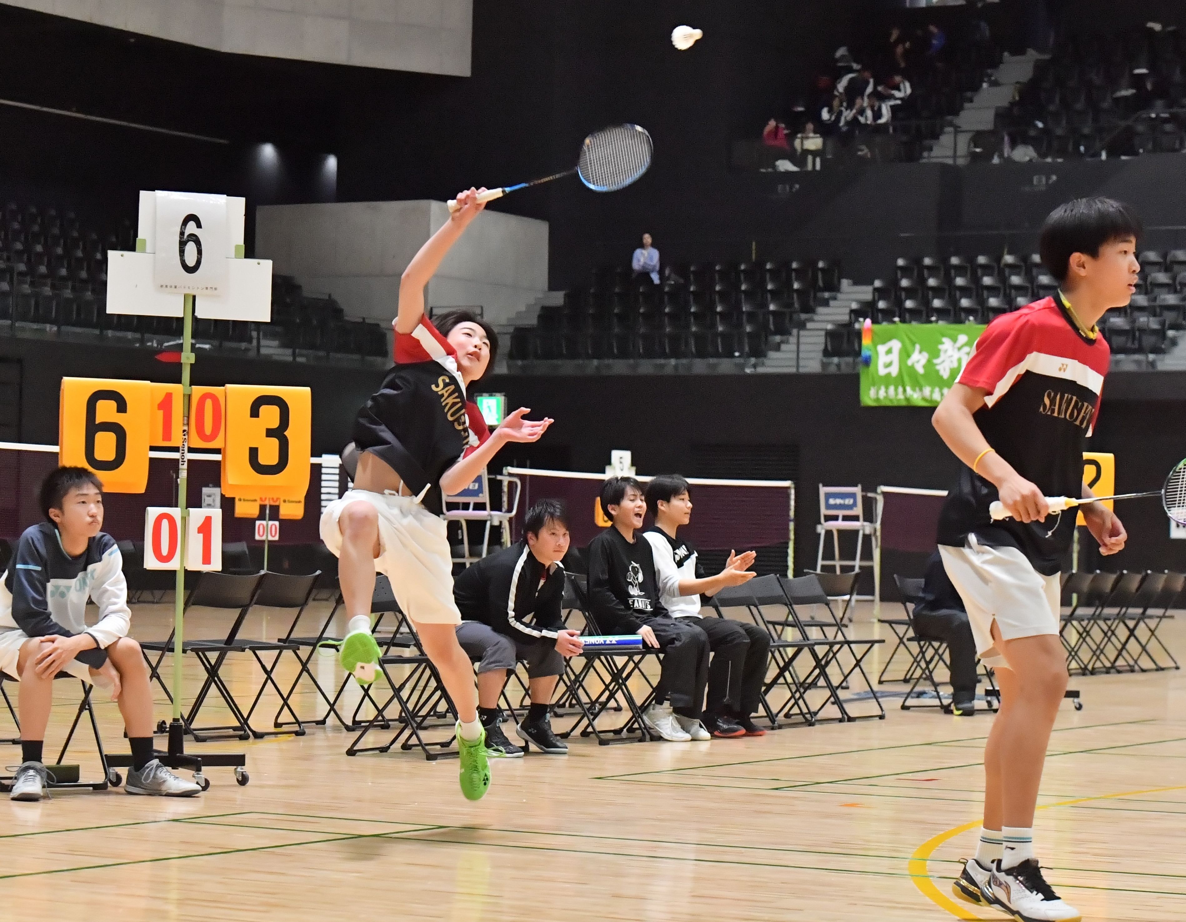 バドミントン男子団体優勝決定戦 作新の松本(左)がスマッシュを放つ。右は村山=日環アリーナ栃木、鈴木航撮影