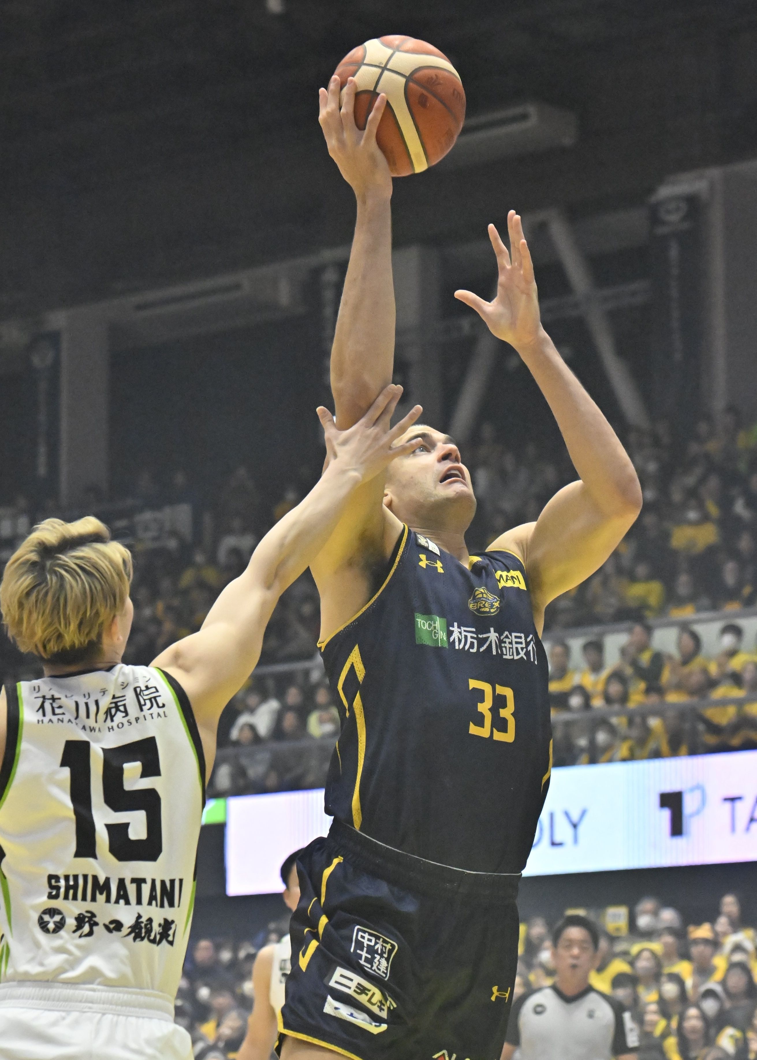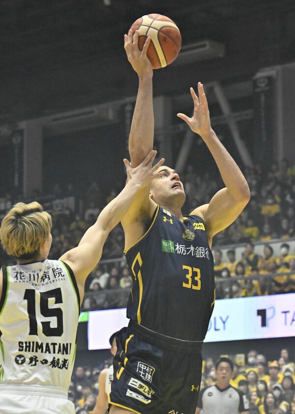 第1クオーター1分、ブレックスのエドワーズ(中央)がファールを受けながらシュートを決める=ブレックスアリーナ宇都宮、加藤竜矢撮影