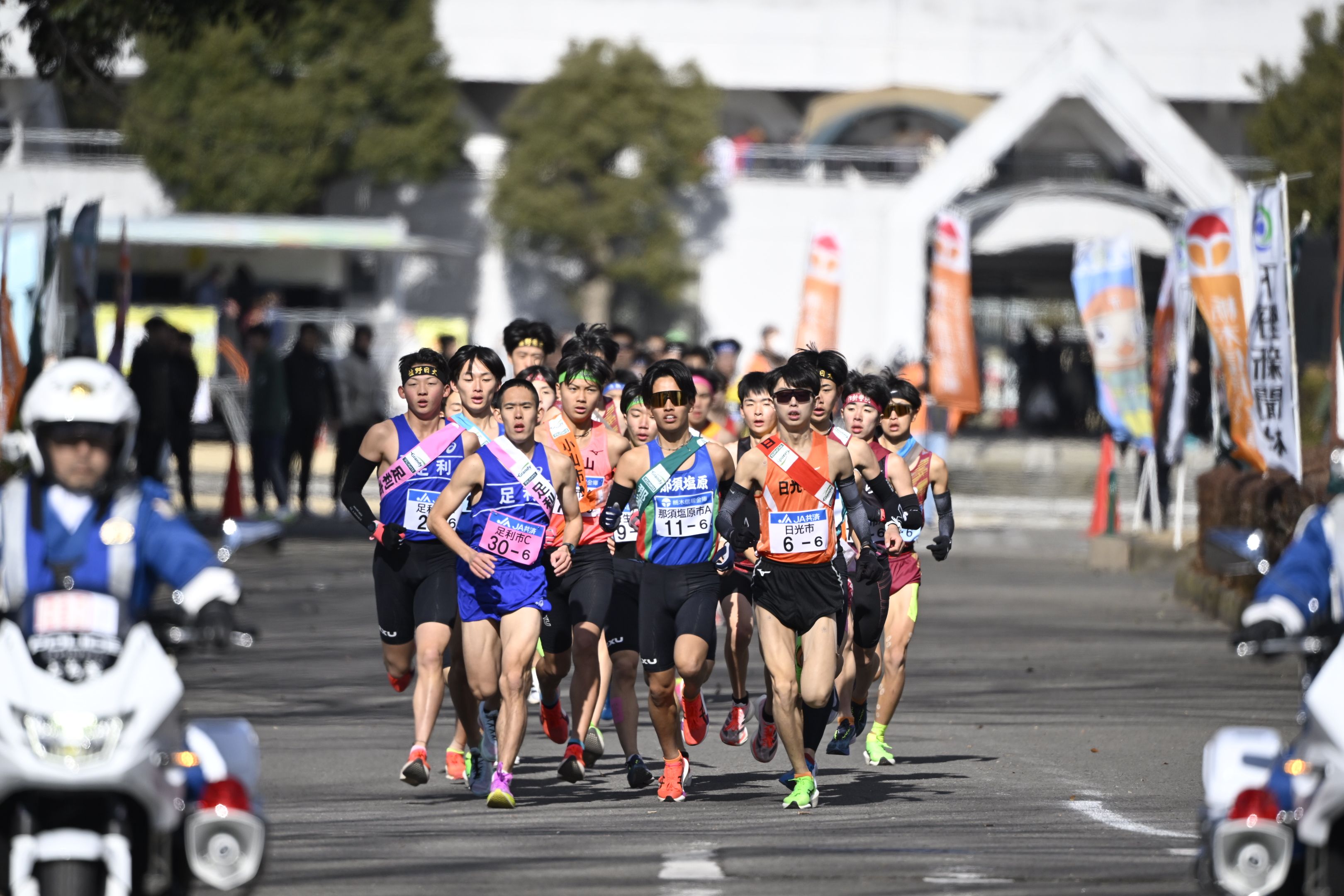 復路を一斉にスタートした各チームの選手たち=栃木市総合運動公園、森田大地撮影