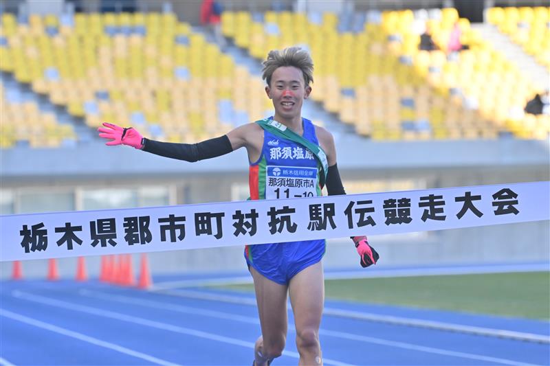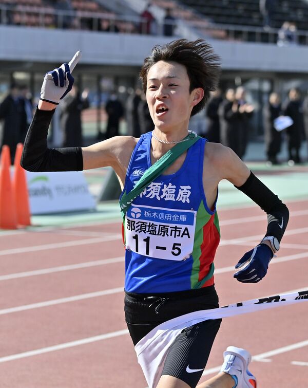 那須塩原Aの5区添田(那須拓陽高)が往路優勝のゴールテープを切る=ニッコークリエートスポーツフィールドとちぎ、磯真奈美撮影