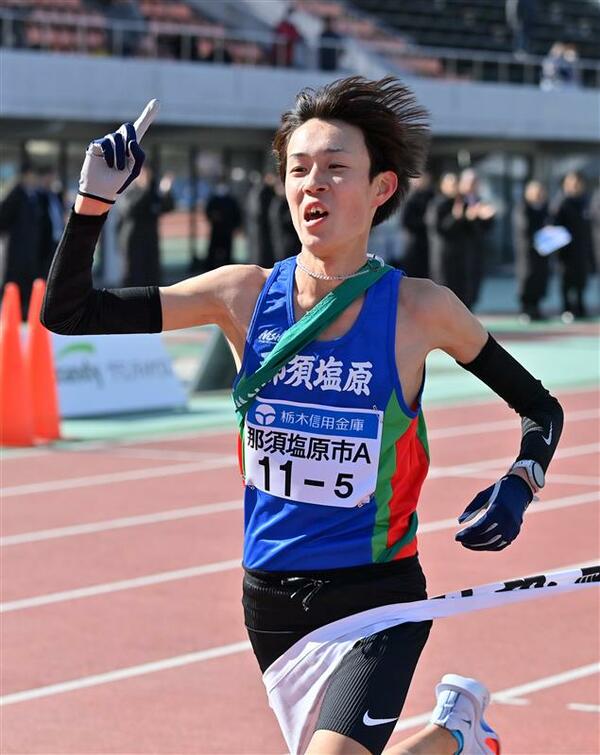 那須塩原Aの5区添田(那須拓陽高)が往路優勝のゴールテープを切る=ニッコークリエートスポーツフィールドとちぎ