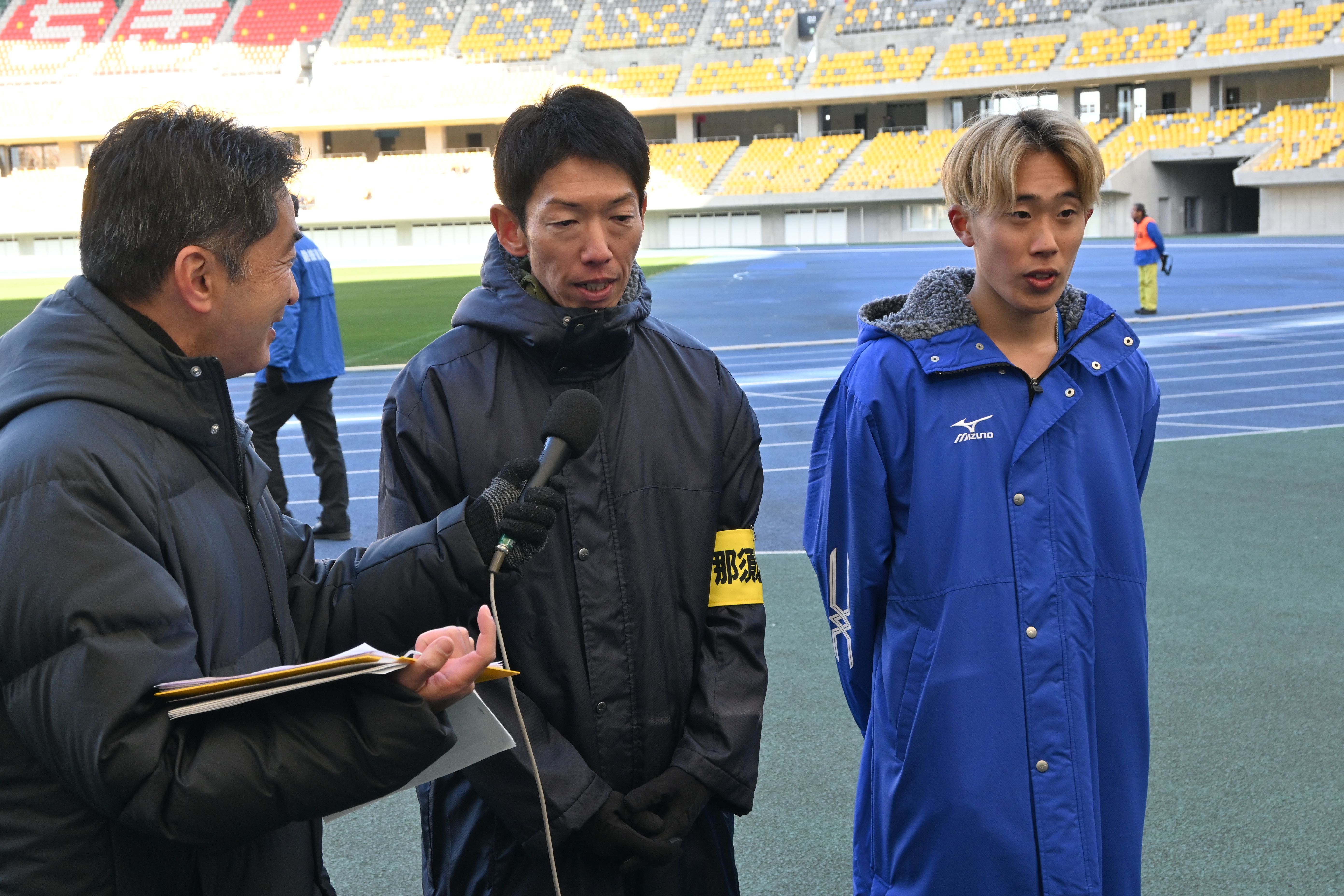 総合4連覇を決めて取材を受ける那須塩原市Aの高久監督(左)とアンカーの東泉