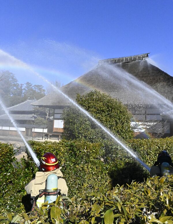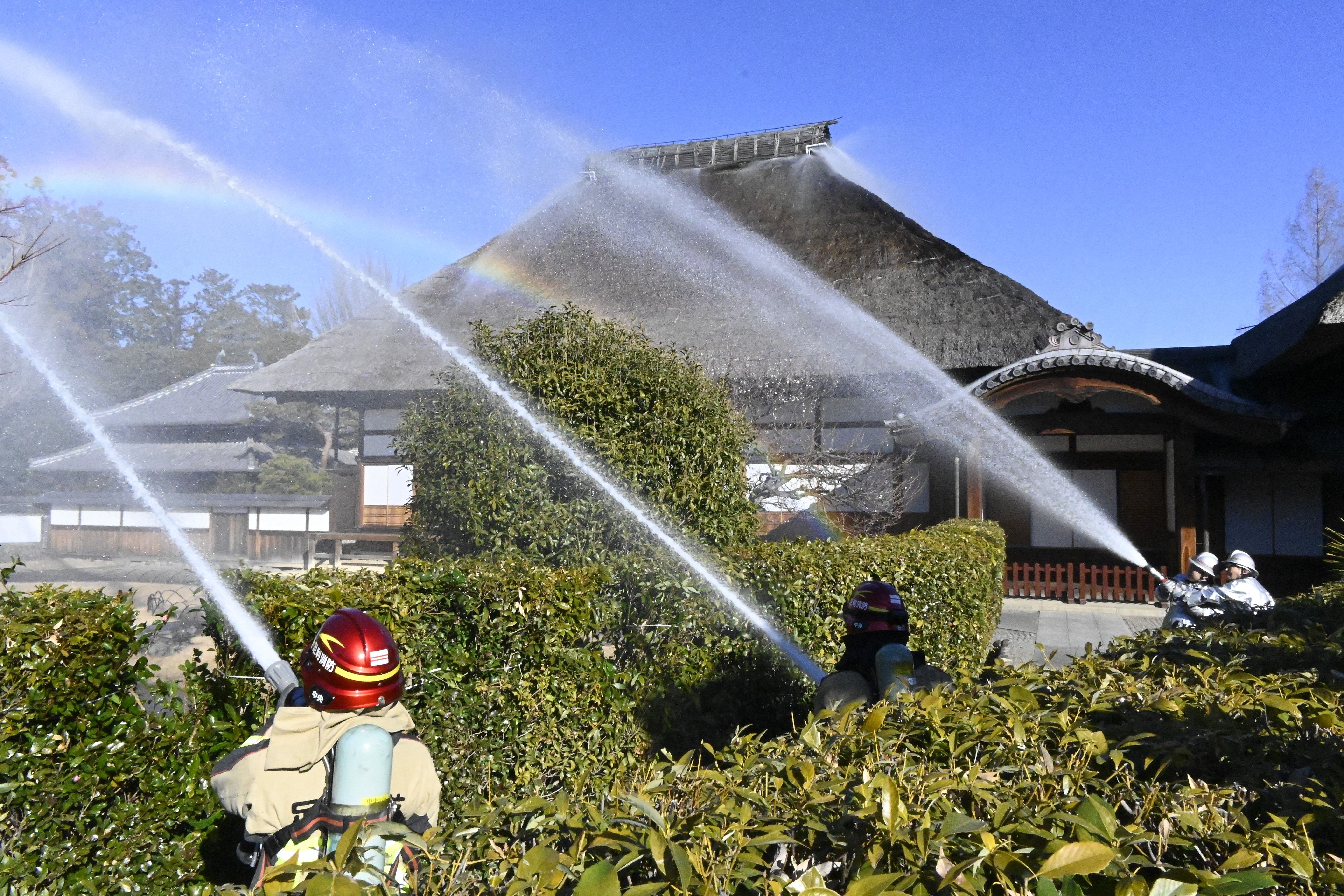史跡足利学校の「方丈」前で放水する消防署員ら