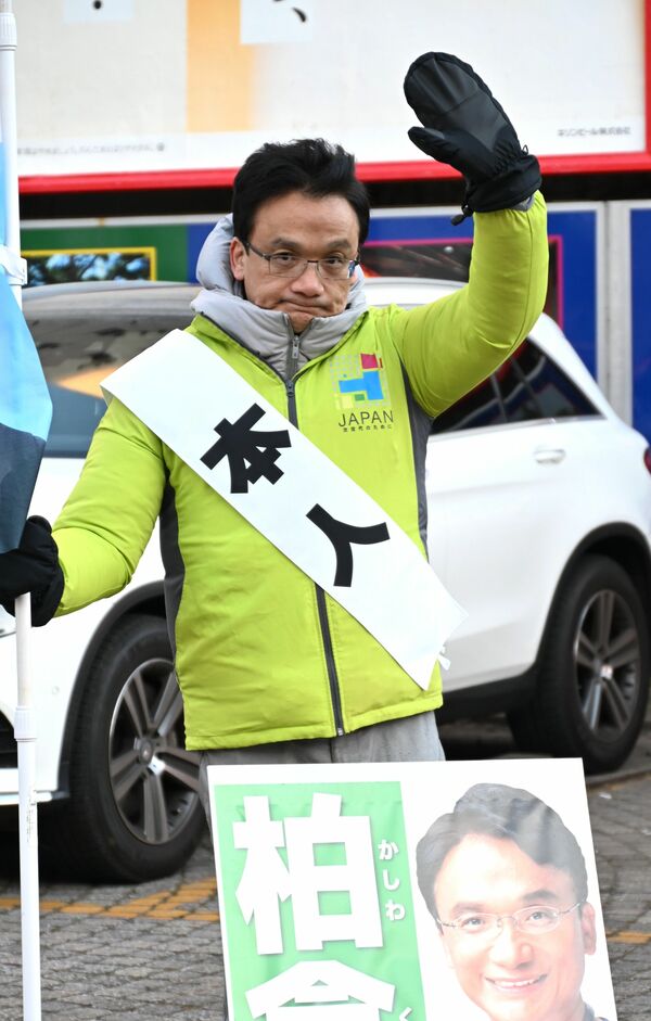 通勤、通学者に手を振る柏倉氏=23日午前、宇都宮市内