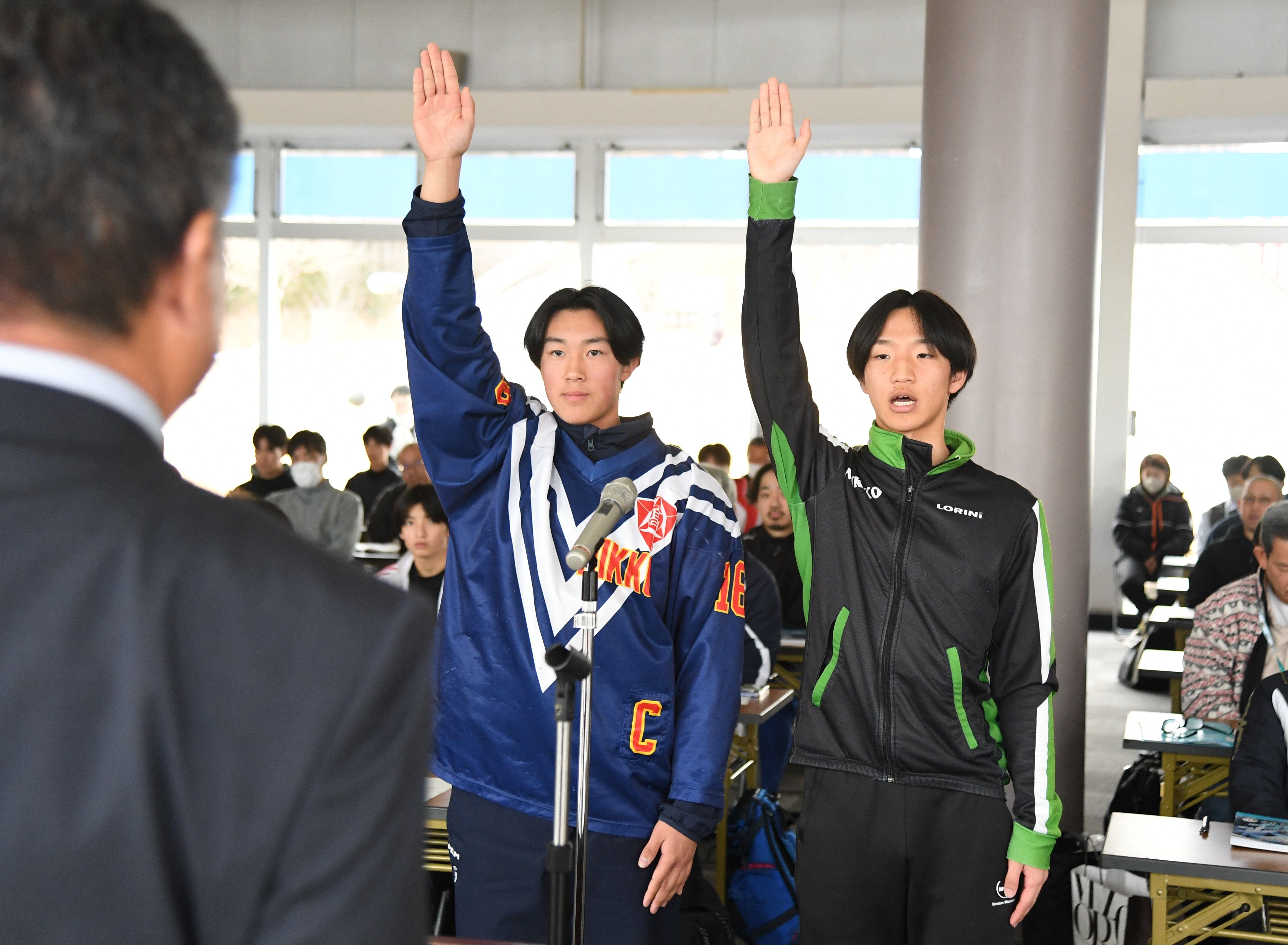 開始式で選手宣誓を行う宇賀神(右)と谷津(ともに日光明峰)=22日午後、日光市所野