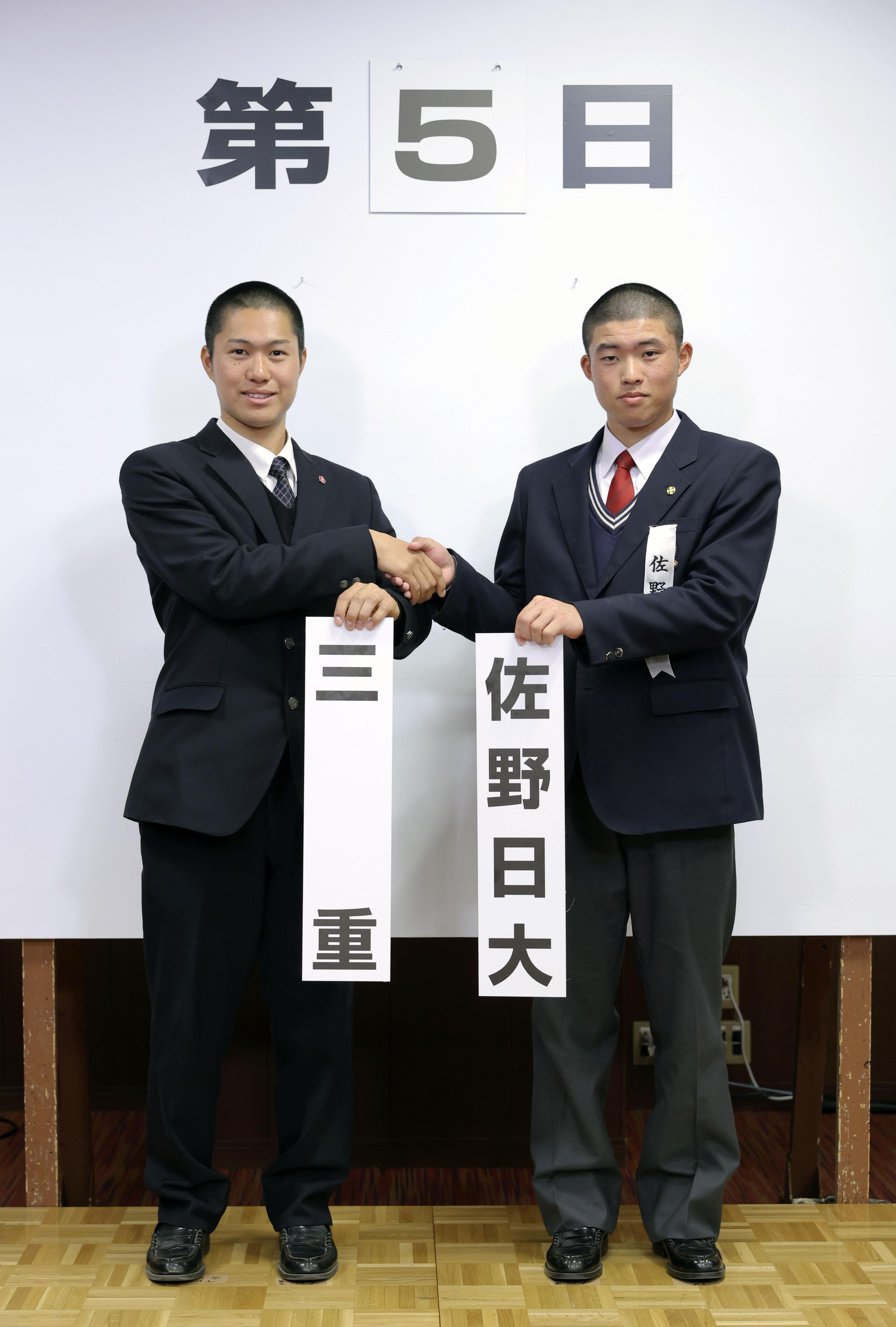 対戦が決まり握手する佐野日大の中村主将(右)と三重の大西主将=6日、大阪市北区(代表撮影)