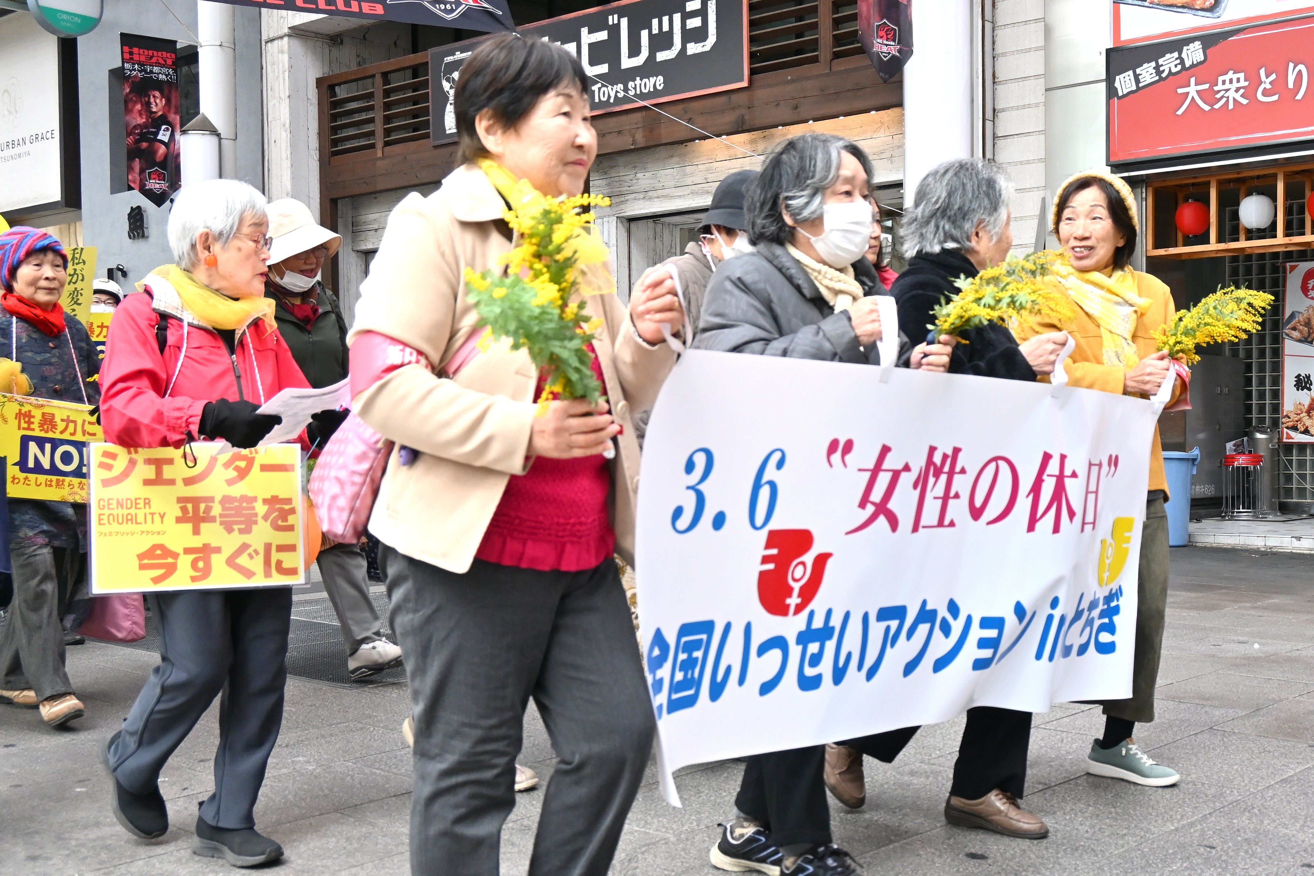 ジェンダー平等を訴えながらパレードする参加者たち=6日午前、宇都宮江野町