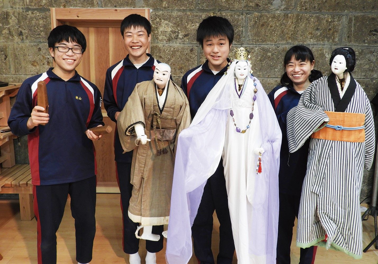 昨年「奈佐原文楽」の活動を行った鹿沼市立北押原中学校創作部の生徒たち。左から元副部長の横山 裕紀(ゆうき)さん、 元創作部部長の本間 結平(きっぺい)さん、三品 遼太(りょうた)さん、島田 愛里(あいり)さん