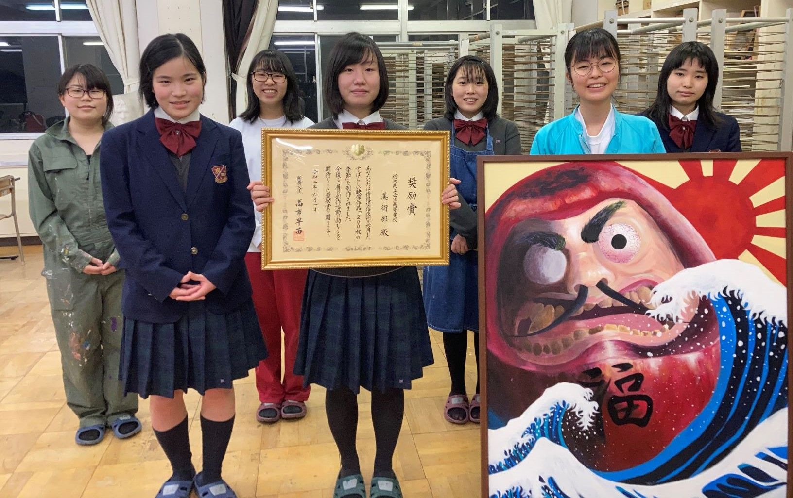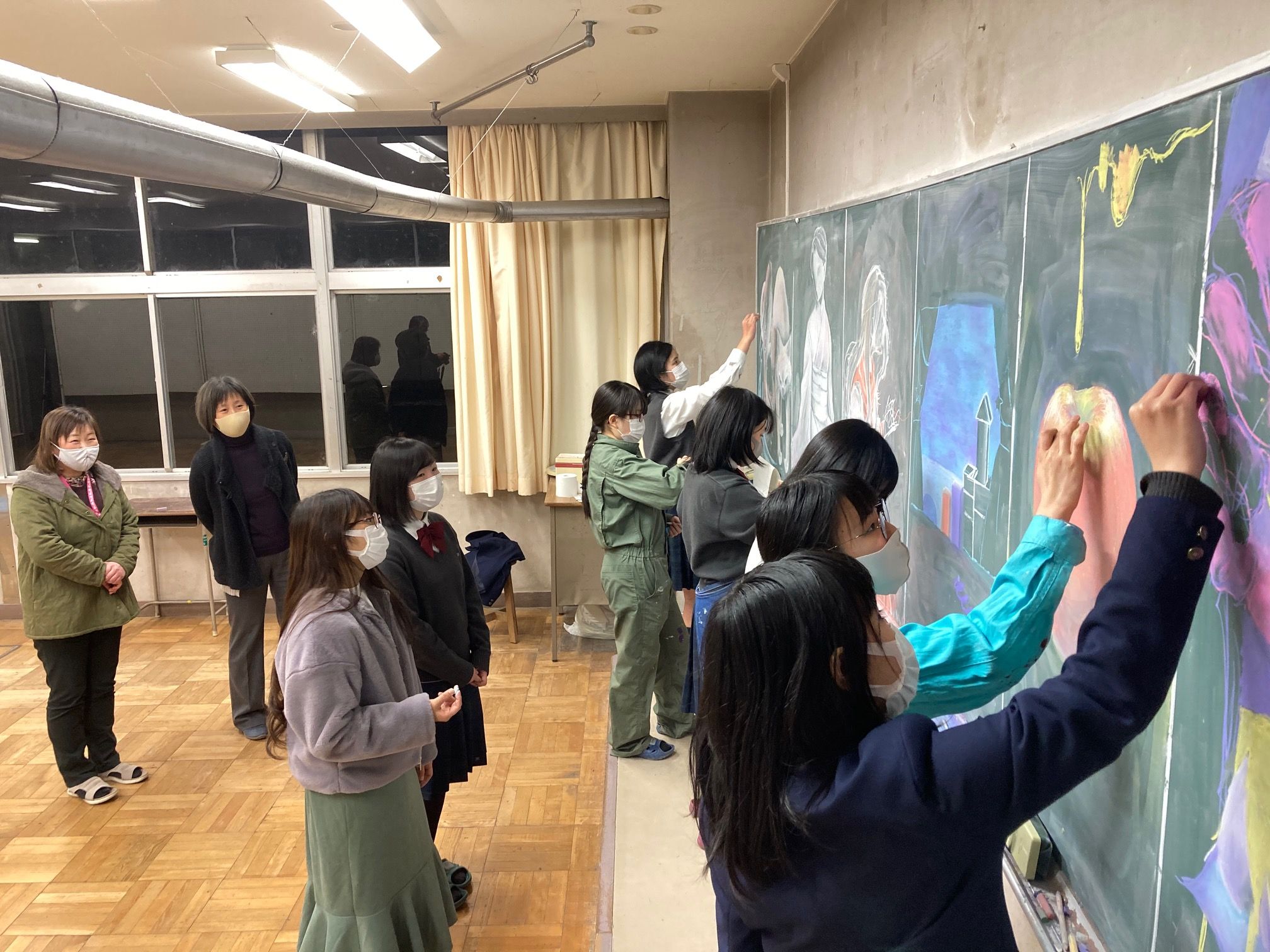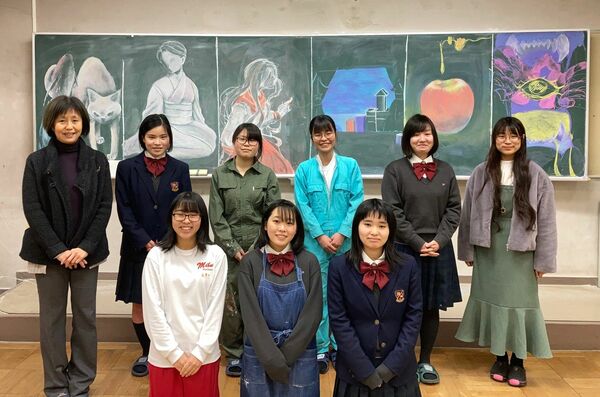 卒業生の藤本 夢(のぞみ)さん(写真中央左)や先輩たちに見守られながら、黒板アートの練習をする生徒たち