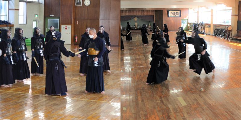 左写真:鈴木さん(中央の右)から実技指導を受ける生徒たち。 短い間合いから技を繰り出します。動きの速さ、技のかけ声も相まって迫力があります