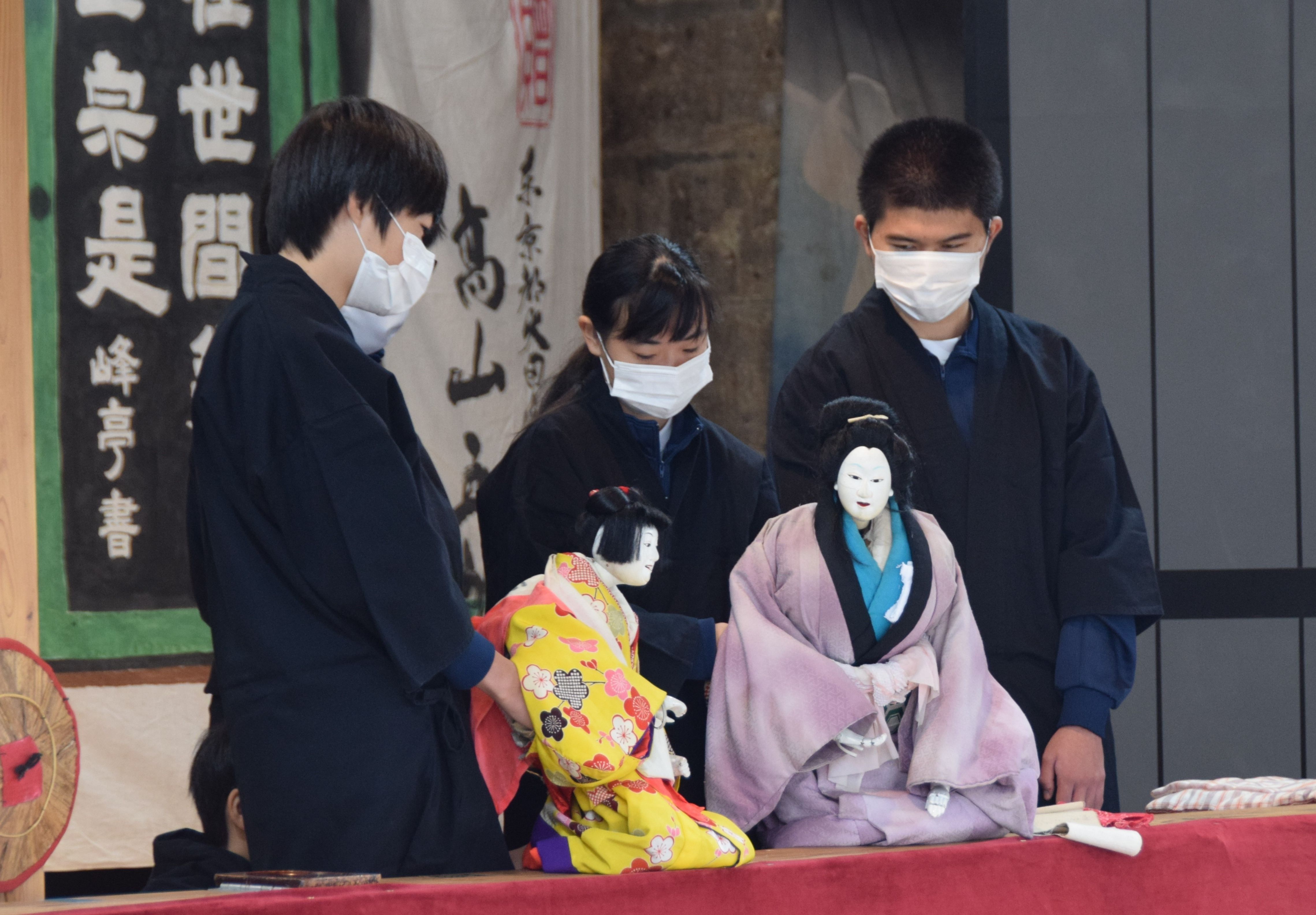 昨年11月の公演で「傾城阿波(けいせいあわ)の鳴門(な ると)巡礼歌の段~十郎兵衛住家(じゅうろべえすみか) の段」を披露する生徒たち
