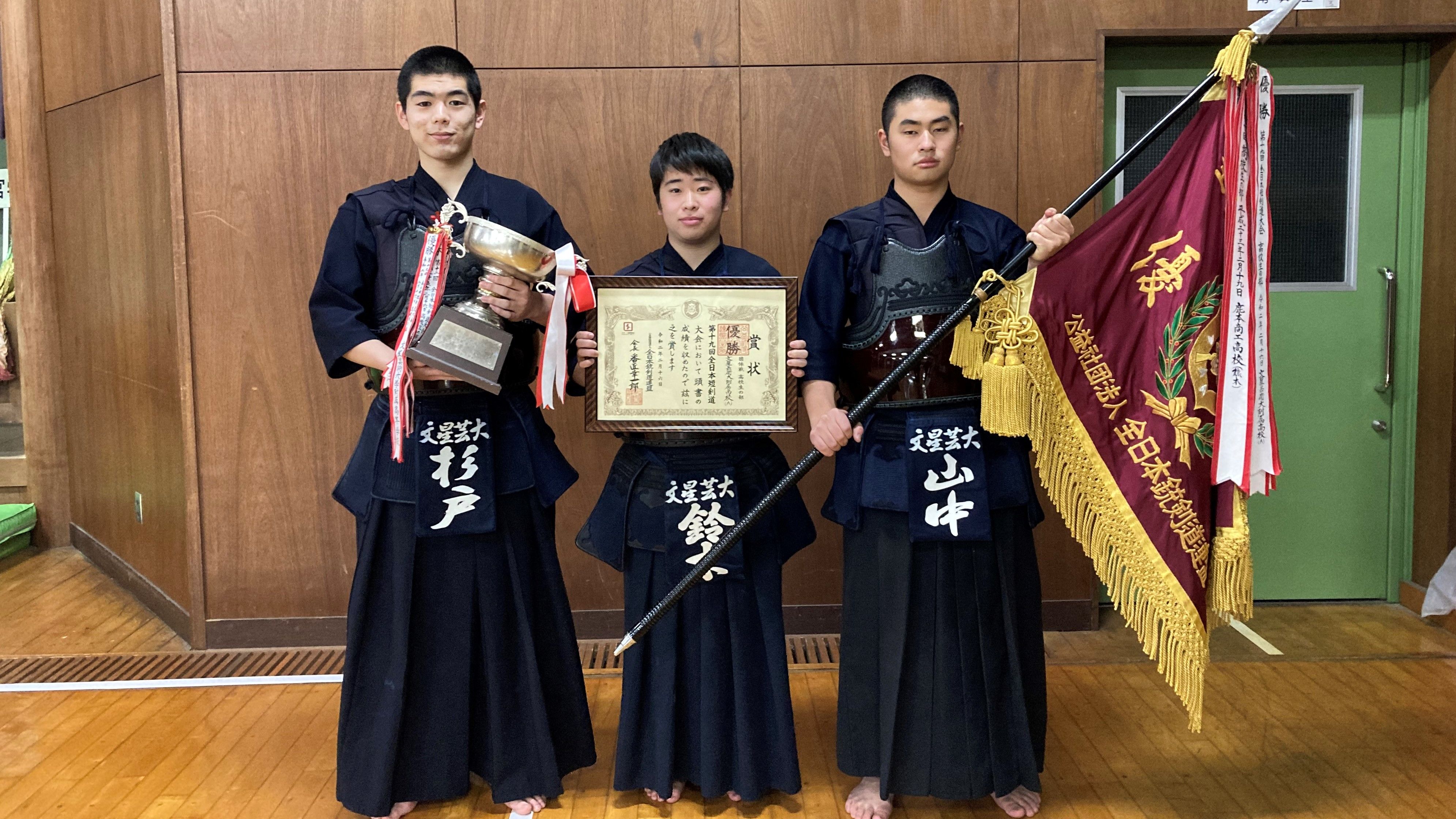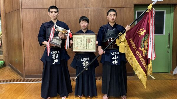 昨年2月の「第19回全日本短剣道大会男子団体高校生の部」で優勝した文星芸術大学附属高校剣道部の短剣道チーム。 左から杉戸 洪太(こうた)さん、鈴木 大空(たすく)さん、山中 大世(だいせい)さん