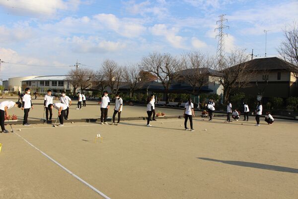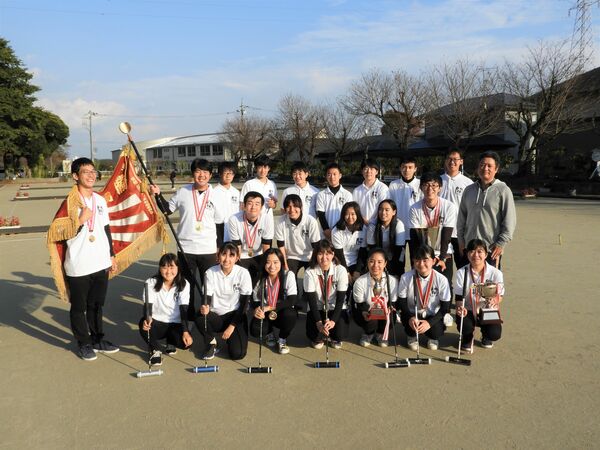 月1回の練習会では、卒業生と在校生が一緒になって練習します。(さくら市総合公園ゲートボール場にて)