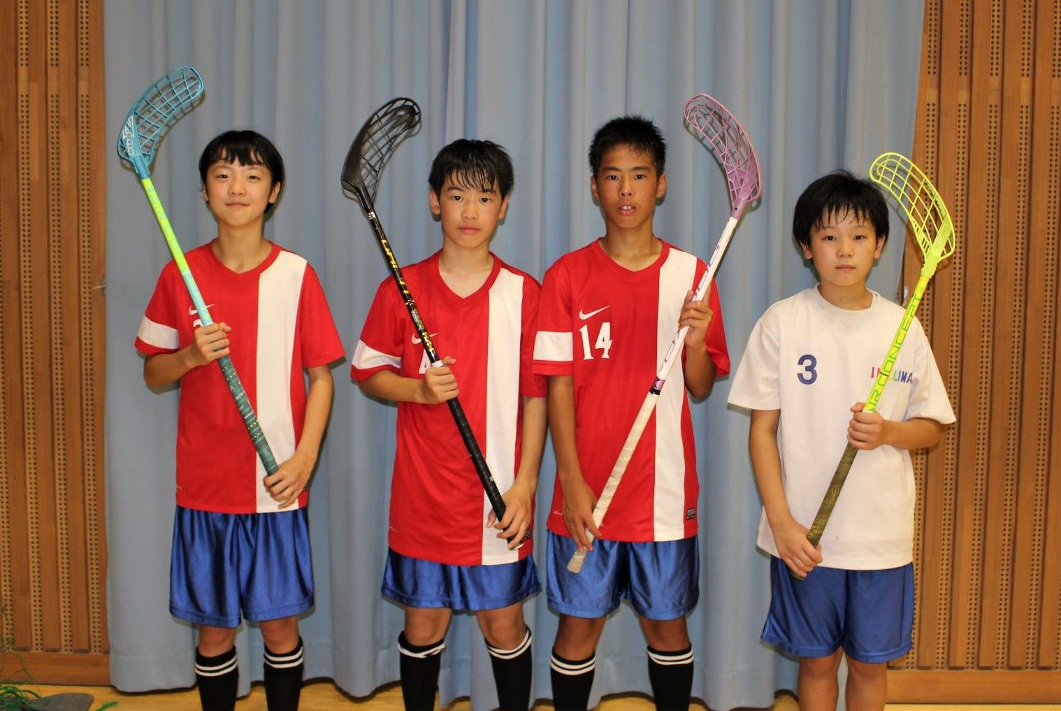 昨年3月の「日本小学生&中高生ネオホッケー選手権2019&幼児大会」小学生高学年混成の部で優勝した選手たち。左から郷間 姫奈(ひめな)さん、柳田 和人(かずと)さん、 柳田 優一(ゆういち)さん、郷間 翔之丞(しょうのすけ)さん。