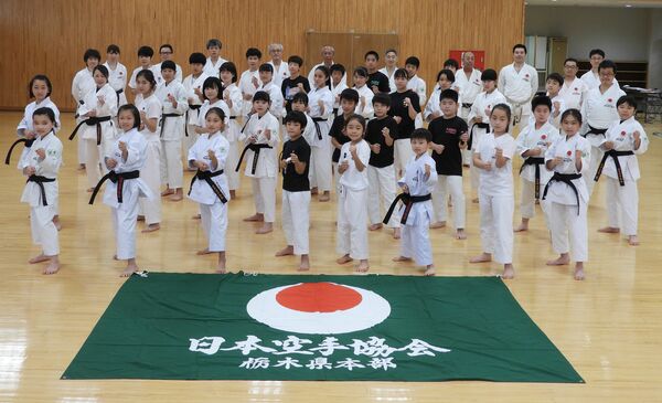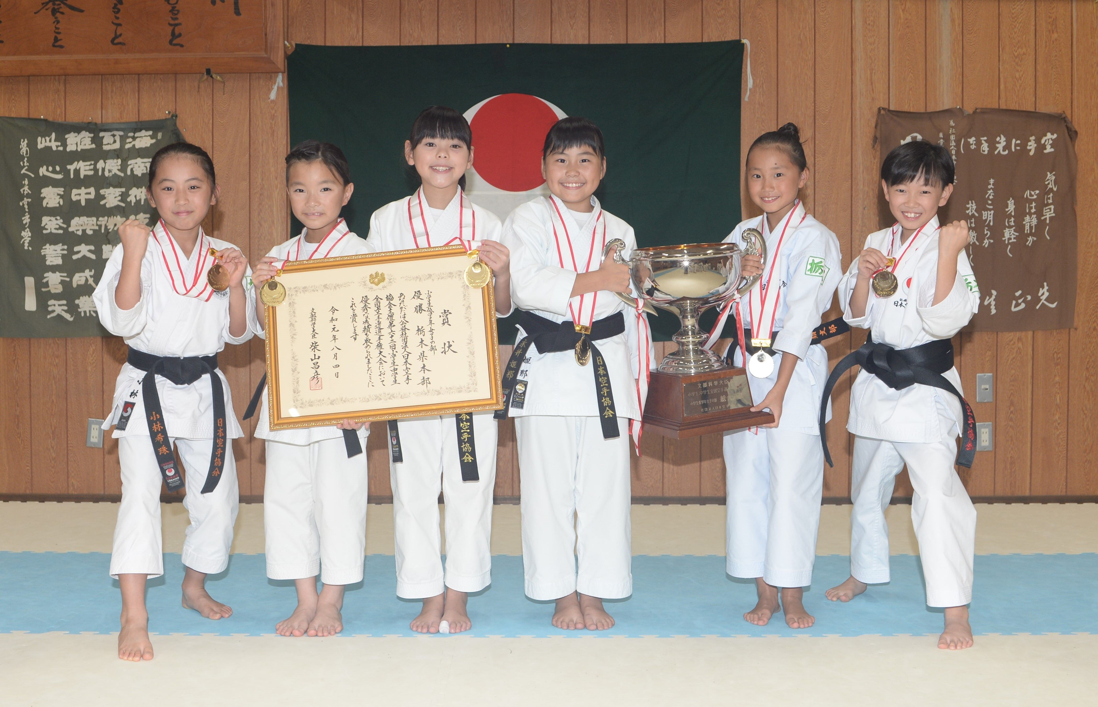 昨年の全国大会で形と組手で優勝し、文部科学大臣杯を勝ち取った選手たち。 左から小林 希珠(のぞみ)さん、長谷川 珠来(じゅら)さん、青木 南似香(みにか)さん、永井 姫那(ひな)さん、川井田 美憂(みう)さん、早乙女 結良(ゆら)さん。