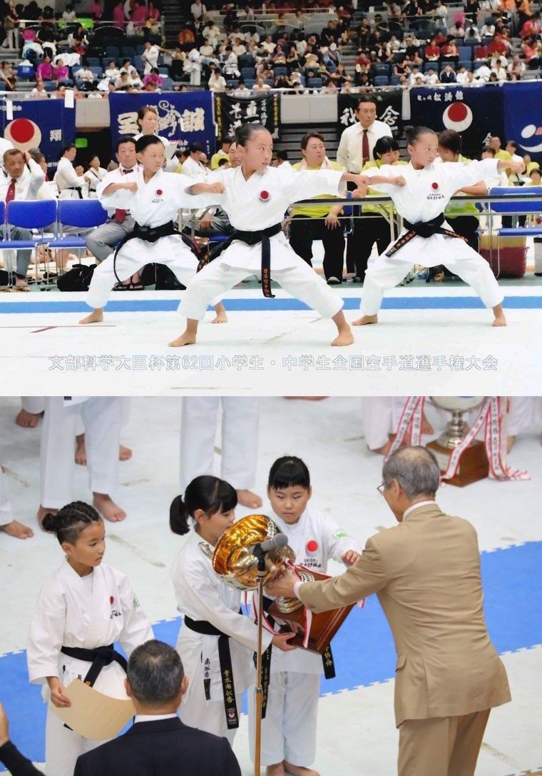 (上の写真) 昨年の全国大会で優勝を飾った形チームの演武。(下の写真) 組手チームも優勝し、完全制覇で文科大臣杯を勝ち取ることができました。