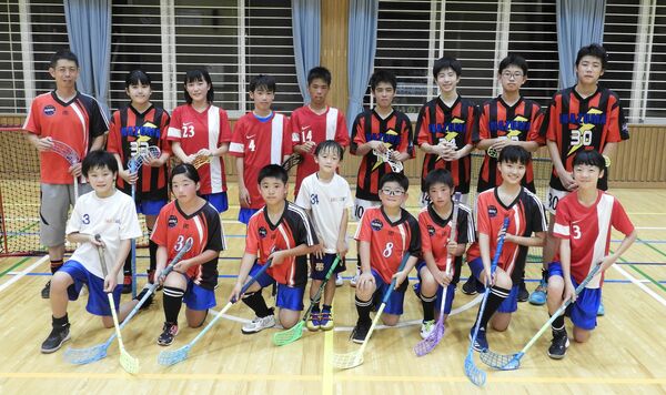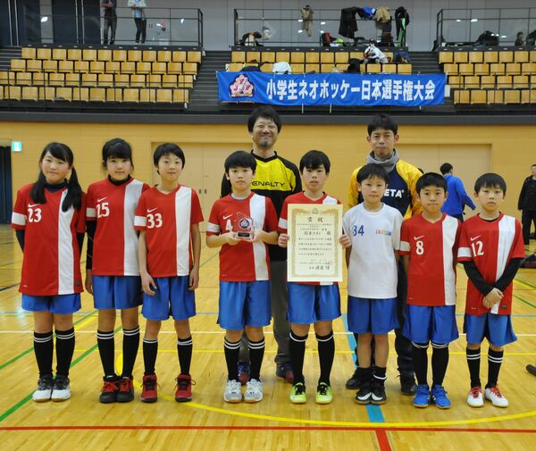 昨年3月、小学生高学年混成の部で優勝したチーム写真。クラブ発足から携わっている柳田監督(後列右側)