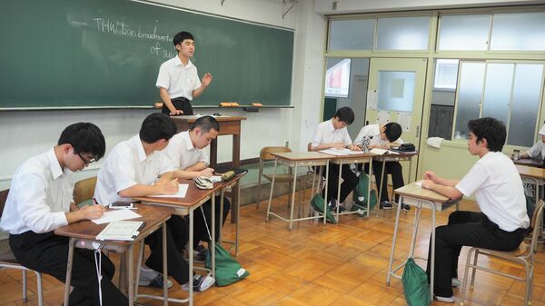 渡邉 康さん(写真中央)は、昨年の全国高校生ディベート大会で最優秀ディベータに選ばれました。中央の発表者の言葉を必死にメモをしていき、質問や反論をしていきます。