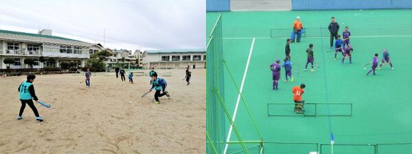 放課後、土日の半日に校庭や市営のホッケー場で練習を行っています。フィールドホッケーの魅力を体験してみては。見学や体験だけでもできます。