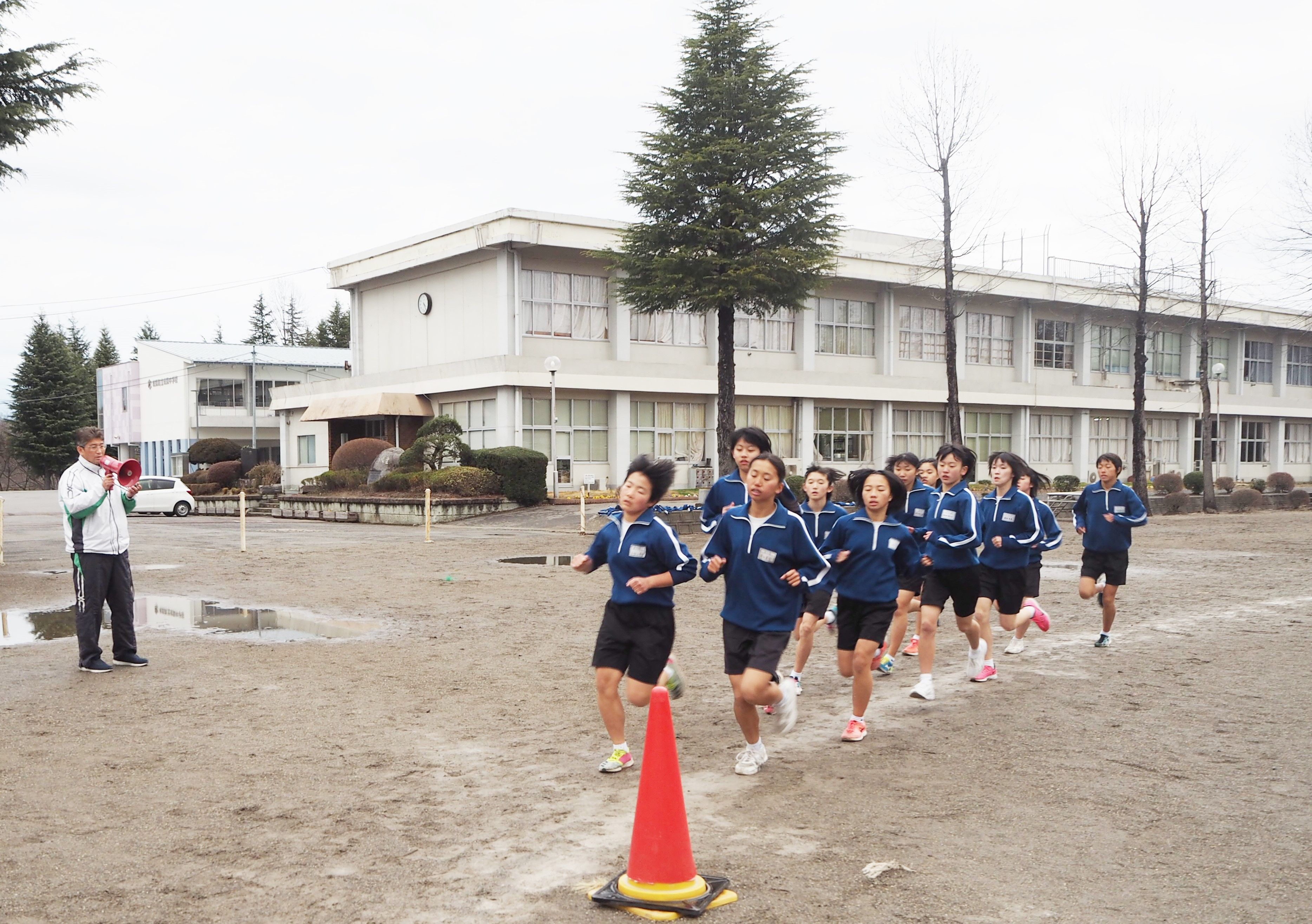 特設駅伝部を指導する桜井教諭(写真左)は、元々は野球部指導者で した。地元の高校で陸上指導法 を吸収するなど、独学で学びました。長野の駅伝強豪校、佐久長聖高 校へ生徒と一緒に、出稽古にも行っています。