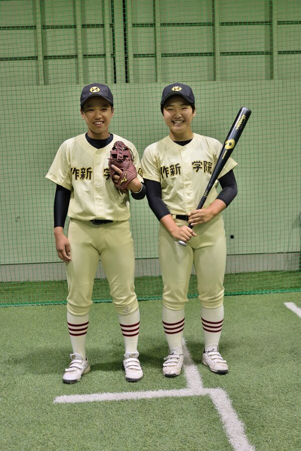 主将で捕手としてチームを牽引した生井美桜さんと一番打者・二塁手の関 桃子さん(写真右)。