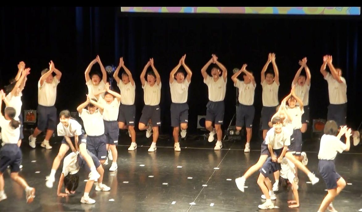 元気で明るい生徒たちの声が体育館に響く練習風景。演技最後の決めポーズの指導をする高野先生(真ん中右)。