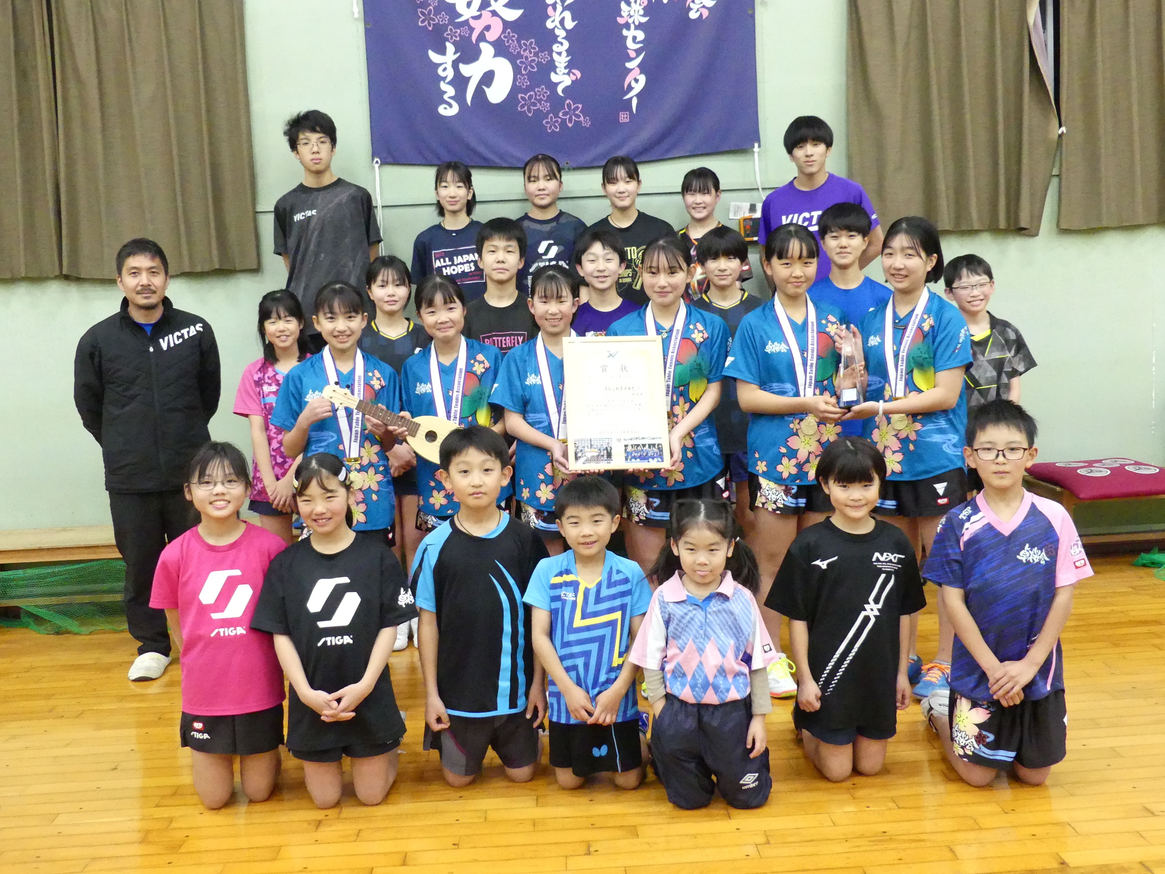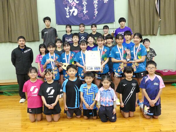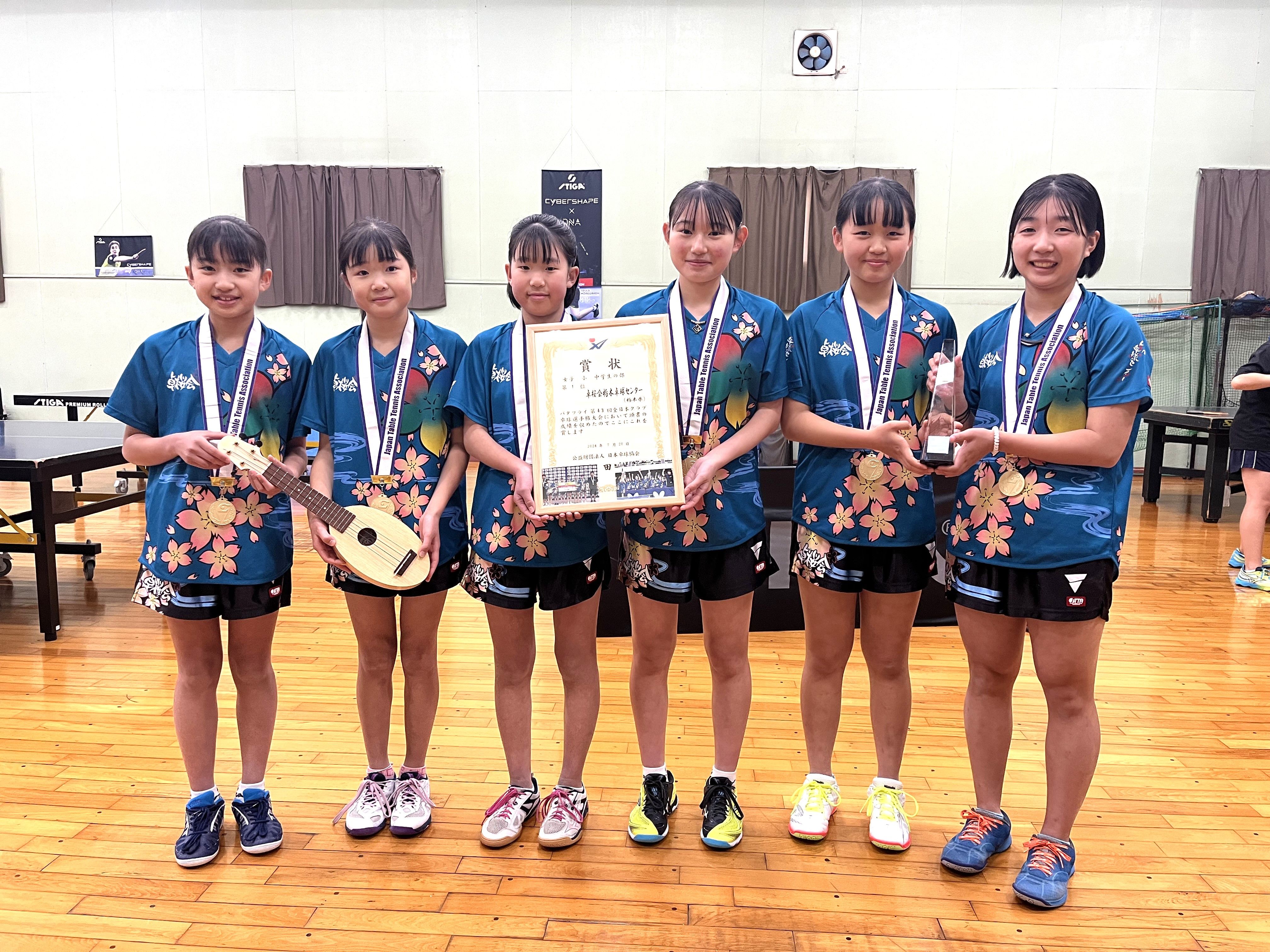 全日本クラブ卓球選手権大会で優勝した、平塚 真帆(ひらつか・まほ)さん(11)、阿部 永愛(あべ・えな)さん(12)、五十畑 寿音(いそはた・ことね)さん(12)、伊藤 心咲(いとう・みさ)さん(15)、原 七星(はら・ななせ)さん(14)、園部 葵彩(そのべ・きさ)さん(14)