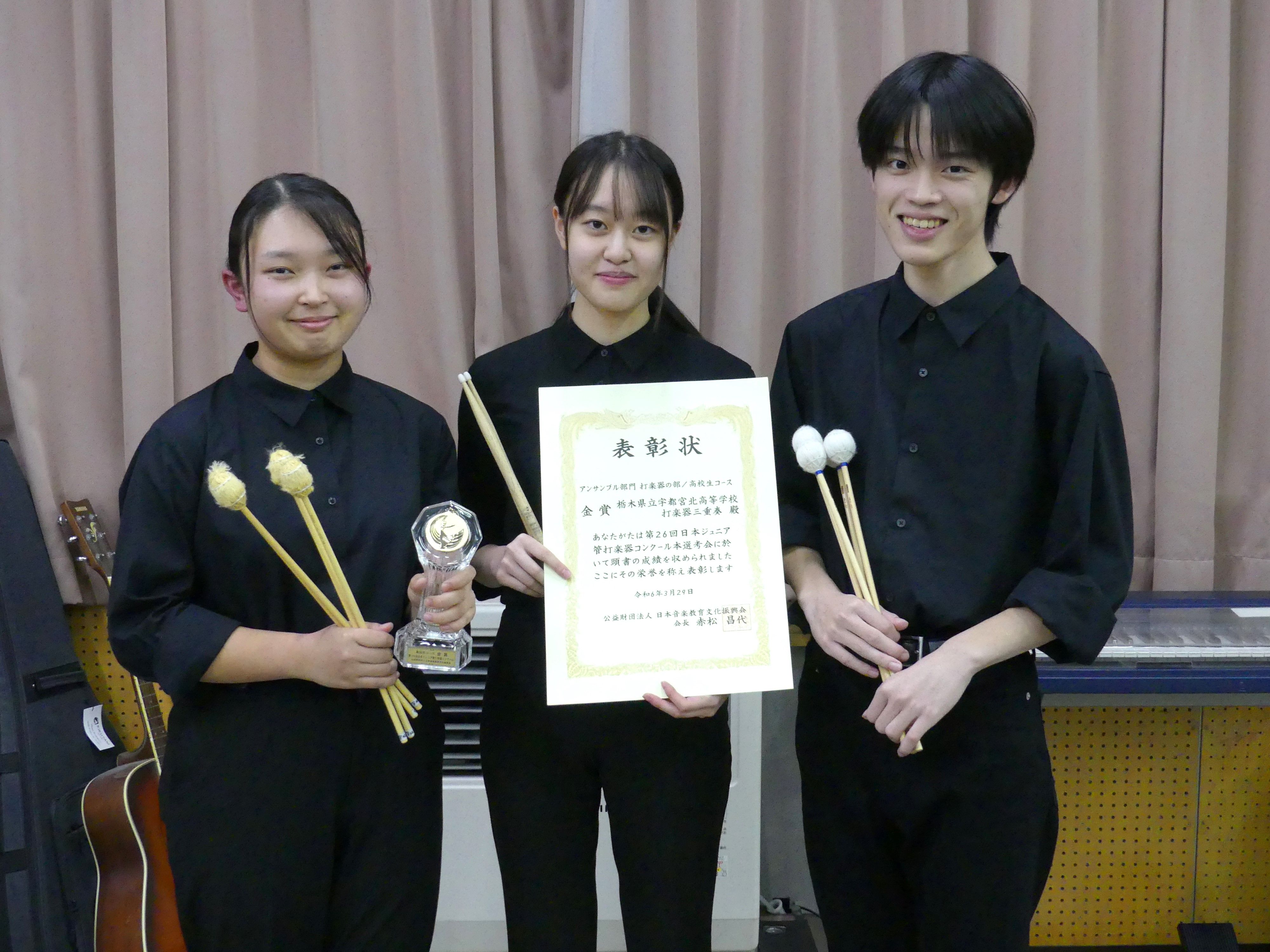日本ジュニア管打楽器コンクールアンサンブル部門打楽器の部で最高賞の金賞に輝いた、河内 美波(かわち・みなみ)さん(16)、軽部 優月(かるべ・ゆづき)さん(18)、加藤 大己(かとう・だいき)さん(16)