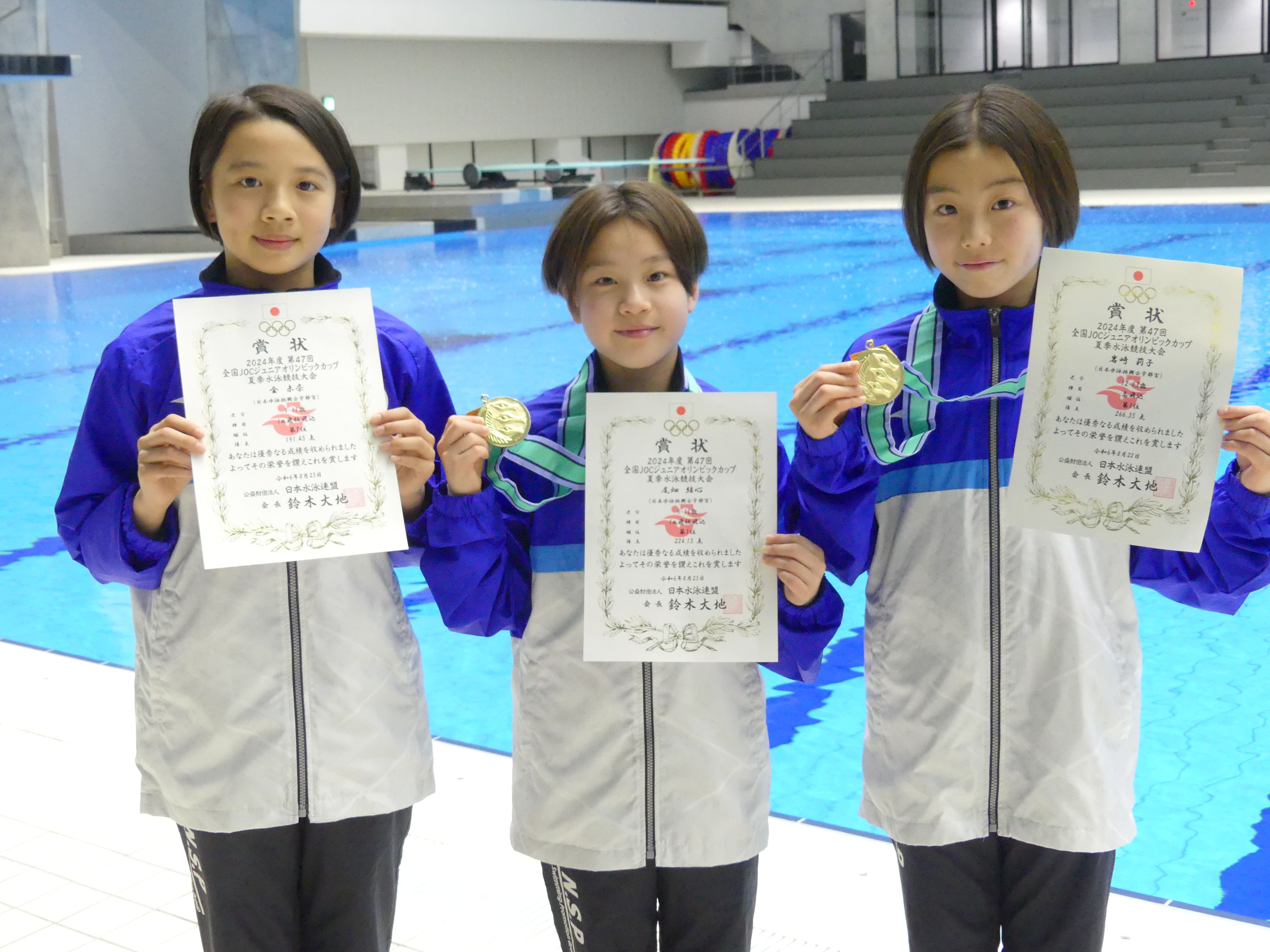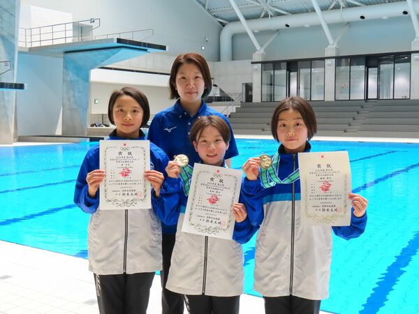 全国JOCジュニアオリンピックカップ夏季水泳競技大会の飛込競技で優勝した、岩崎 莉子(いわさき・りこ)さん(12)尾畑 結心(おばた・ゆいな)さん(11)(右から)。入賞した金 未奈(こん・みな)さん(12)(左)