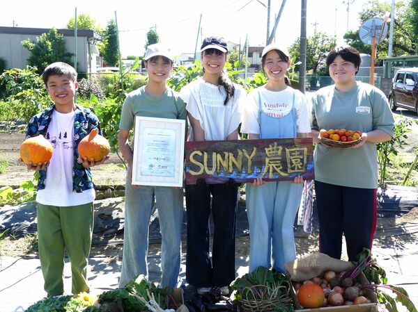「サニー農園」で主体となって活動する中学生たち。左から高橋 快成(たかはし・かいせい)さん、増田 椛(ますだ・もみじ)さん、増田 杏(ますだ・あんず)さん、生井 夏帆(なまい・なつほ)さん、吉澤 見知(よしざわ・みち)さん