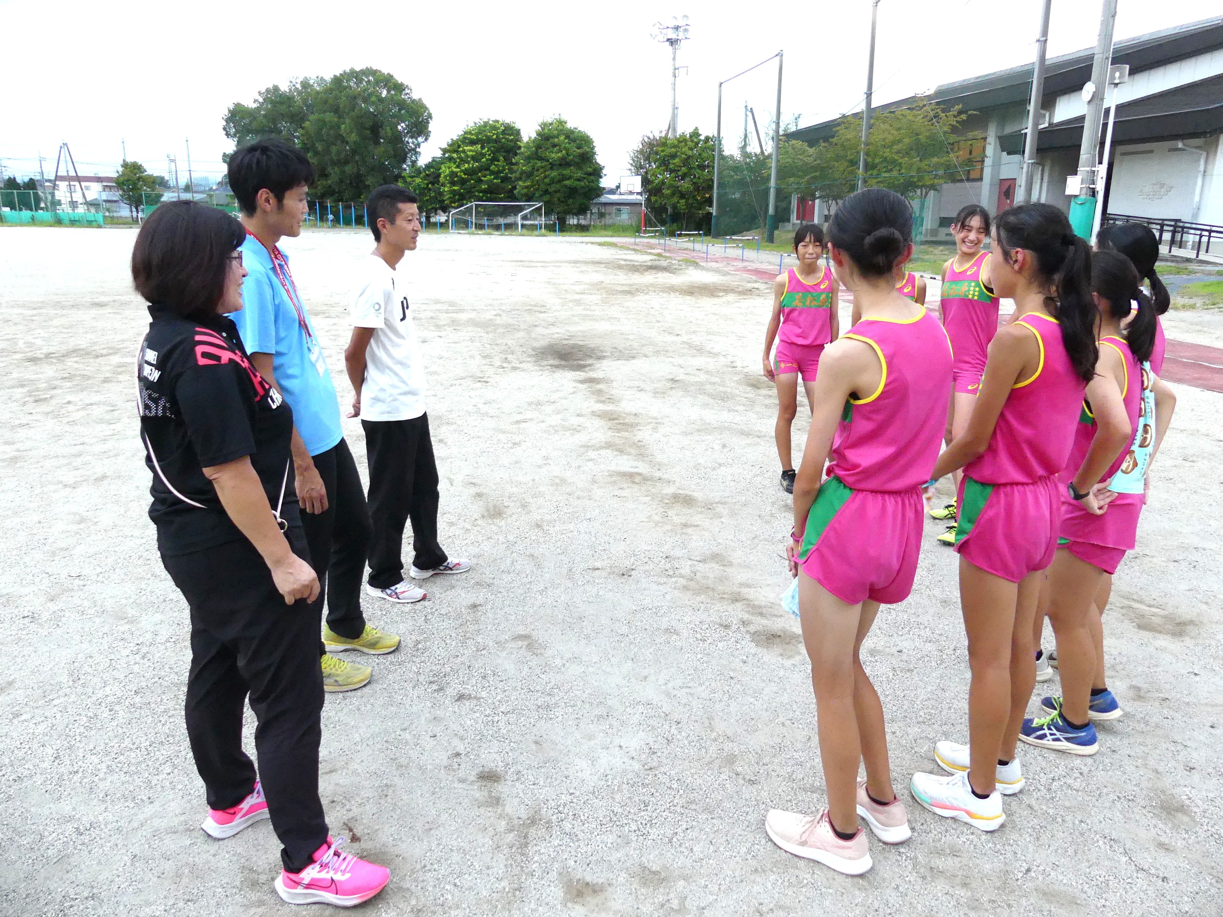若松原中学校陸上競技部の顧問として指導にあたる佐藤 美雪(さとう・みゆき)先生、檜山 弘毅(ひやま・ひろき)先生、野上 善弘(のがみ・よしひろ)コーチ